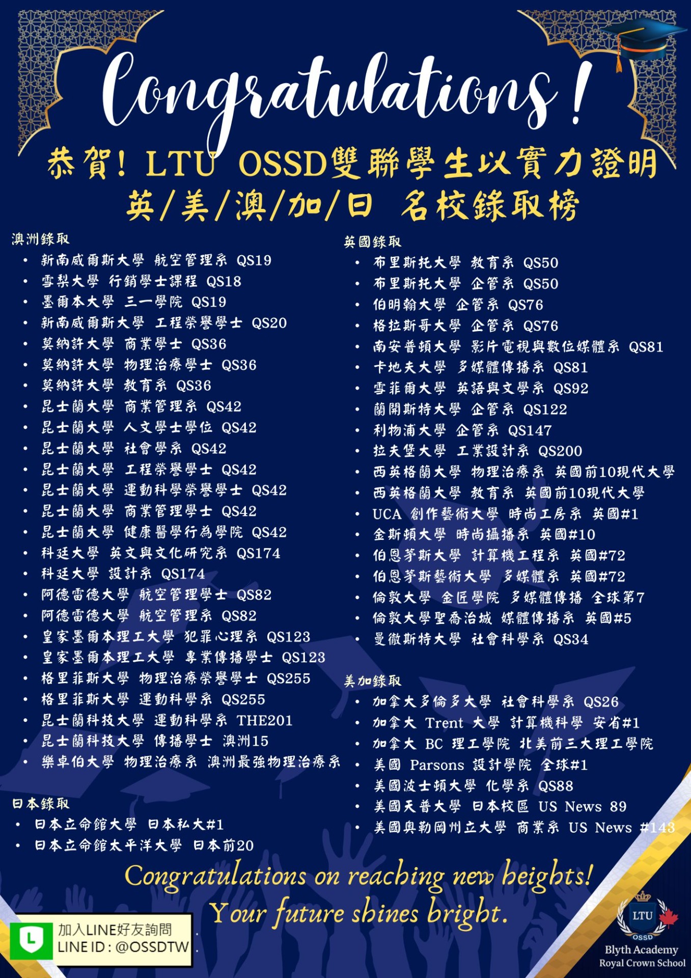 LTU布萊斯OSSD台灣辦公室在此恭賀同學,也期待明後年有更多同學一起加入雙聯OSSD的行列,完成挑戰世界頂大的夢想!