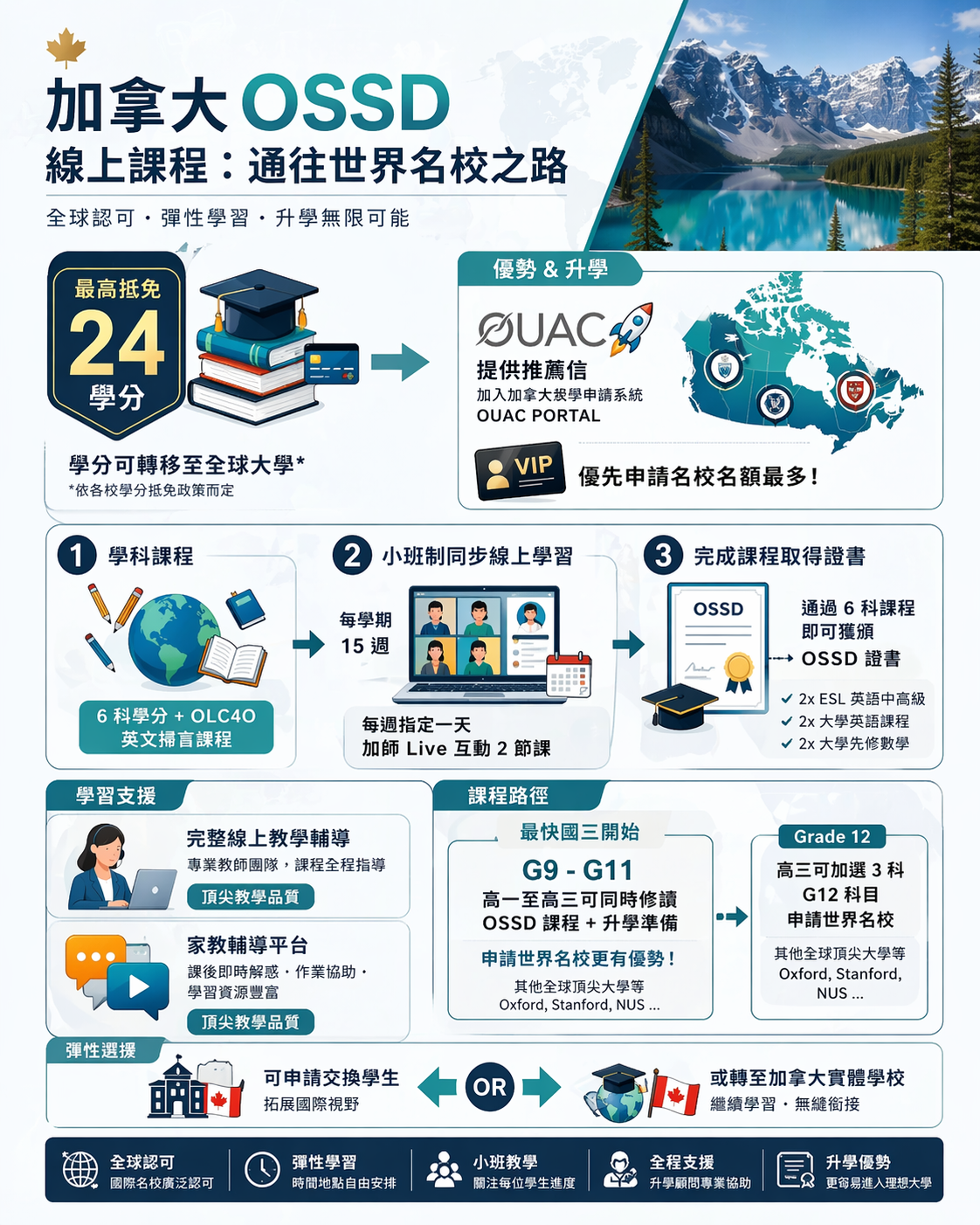 - 保障錄取名校 : 拜訪英加澳美新各地聲譽卓著學校,洽談簽約,保障錄取LTU OSSD雙聯學生。